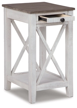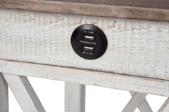 Modern meets vintage in this accent table. Made of wood, it creates a vintage vibe with a distressed white and gray finish and crossbuck supports on two sides. Two USB charging ports add modern function. This is a must-have piece for your living space.