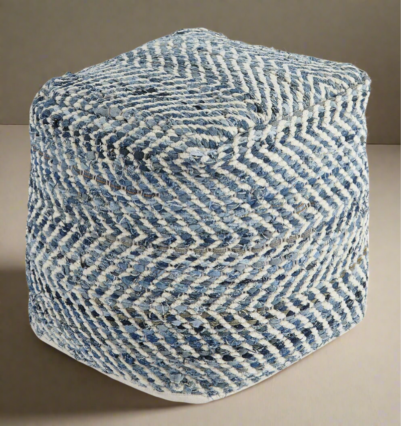 Square Hand Made Pouf. Made of Recycled Denim. Shell with zipper with 100% EPS beads filler. Spot Clean Only.