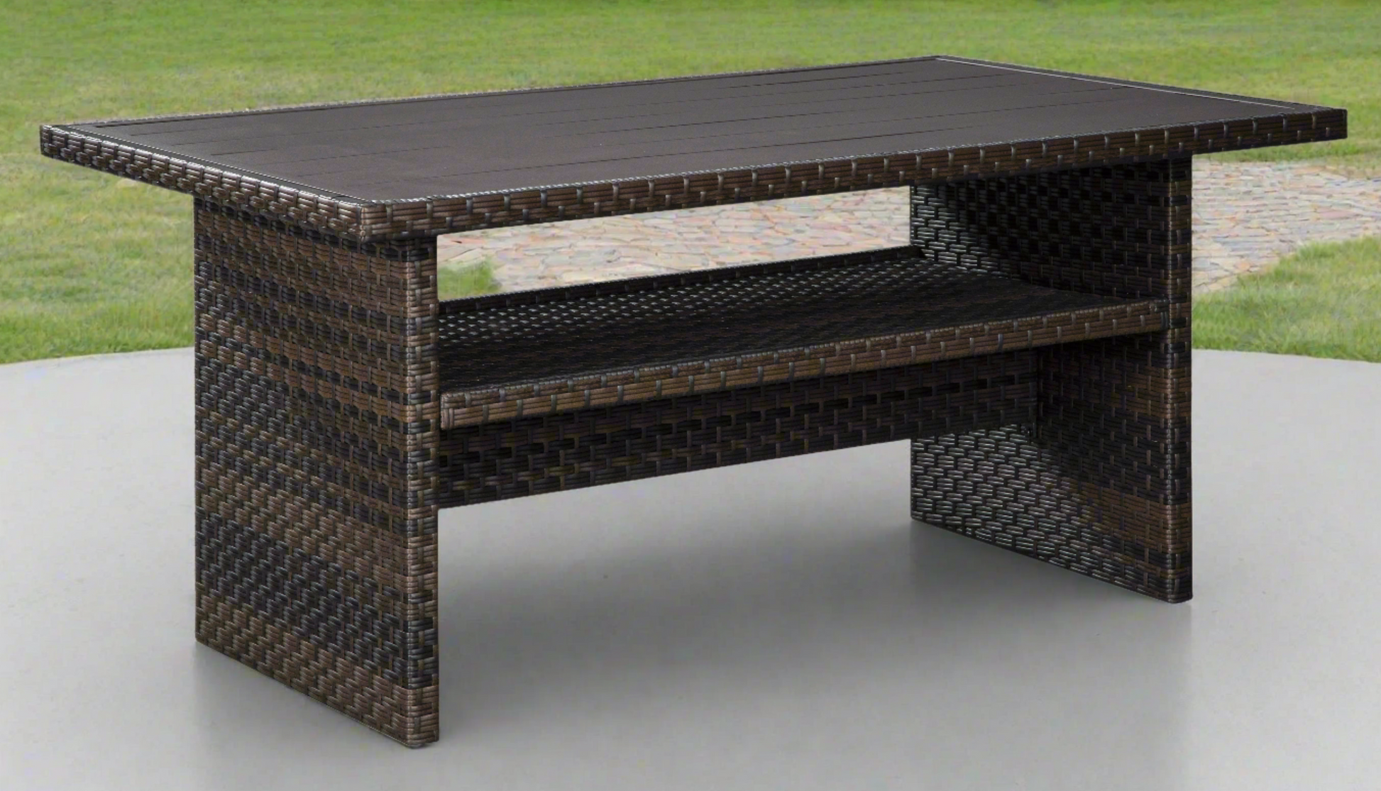 Al fresco living is easy to love with this multi-use table. Its raised height makes it perfect for everything from mealtime, game time, a round of cards or a round of drinks. Resin wicker over a rust-free aluminum frame lends an upscale aesthetic that's downright durable. Aluminum top is conveniently water and stain resistant.