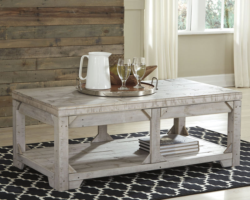Take in the country fresh look of this lift top coffee table and reminisce of a simpler time. Its farmhouse style is evident in its stocky design with planked top/bottom shelf, unique triangle accents and relaxed white washed finish. With a handcrafted look, you'll love the casual feel this piece brings to your living area. Plus, easy lift-top feature accommodates eating or working in front of the television.