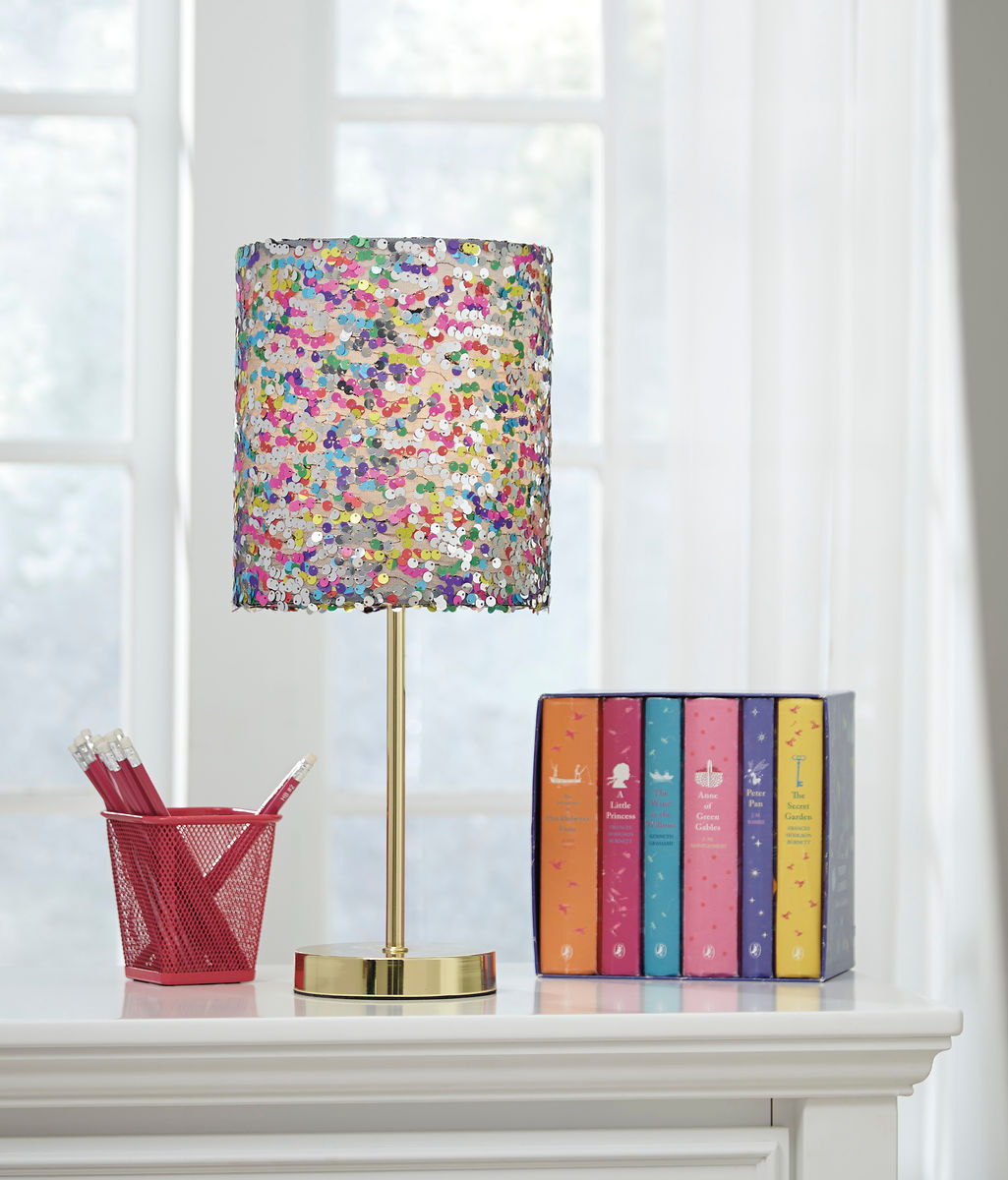 Is your little one all about the glam factor? If so, she'll love this table lamp. Multicolored sequined drum shade lights up her room in style. Goldtone metal base is a classy touch to this glitzy design.