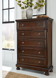 The quality craftsmanship is clear to see. The classic design elements—including antiqued hardware and bun feet—are easy to love. Satisfying your taste for traditional furnishings, the Porter chest of drawers is elegant without looking fussy. Five roomy drawers keep your wardrobe organized in style.