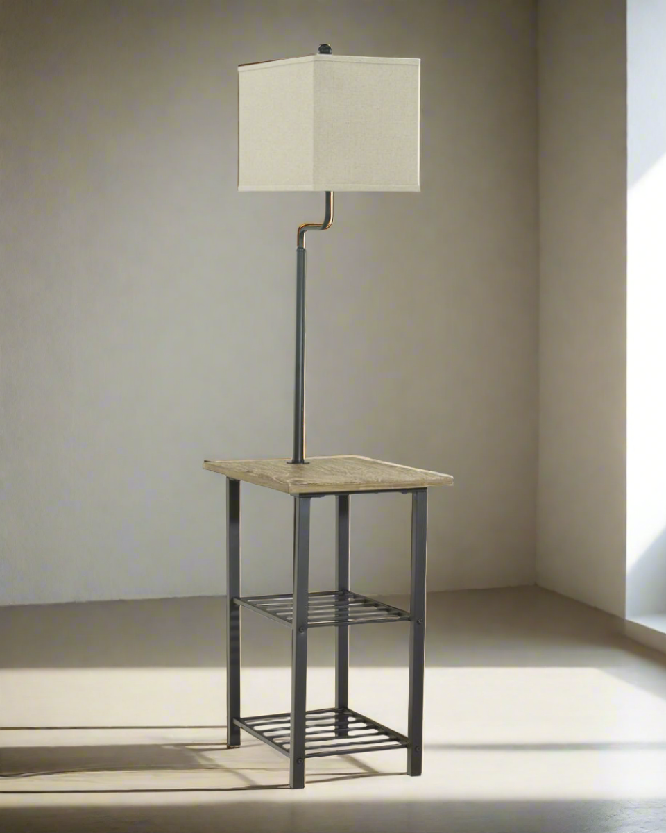 This metal tray lamp seamlessly integrates tabletop and dual rack space with an overhead lamp, putting multifunctional furnishings in a new light. What an especially bright idea when you’re tight on space.