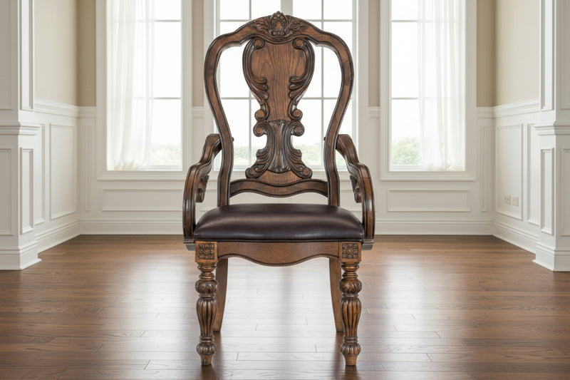 The grand scale of the Bergen Collection invokes a timeless aesthetic for your home’s traditional dining room. The dark oak finish highlights the distinct oak veneer of the collection, while also lending contrast to the decorative pattern of the tabletop’s design. Faux keyhole hardware fronts the doors of the china, server, and curio, while traditional bale hardware fronts the drawers. The glass doors of the auxiliary pieces allow for enclosed display of your tabletop accessories and decorative items. Traditional accenting abounds throughout the collection with classic routed pilasters, moldings, and decorative pediments gracing the design.