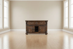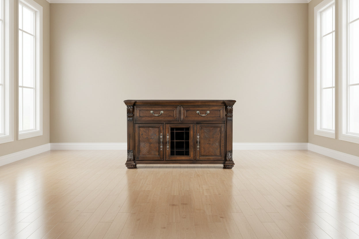 The grand scale of the Bergen Collection invokes a timeless aesthetic for your home’s traditional dining room. The dark oak finish highlights the distinct oak veneer of the collection, while also lending contrast to the decorative pattern of the tabletop’s design. Faux keyhole hardware fronts the doors of the china, server, and curio, while traditional bale hardware fronts the drawers. The glass doors of the auxiliary pieces allow for enclosed display of your tabletop accessories and decorative items. Traditional accenting abounds throughout the collection with classic routed pilasters, moldings, and decorative pediments gracing the design.