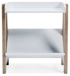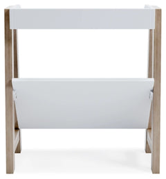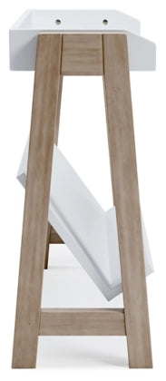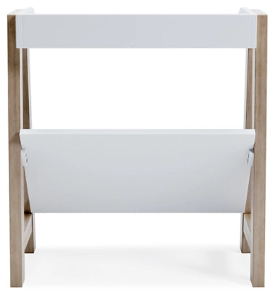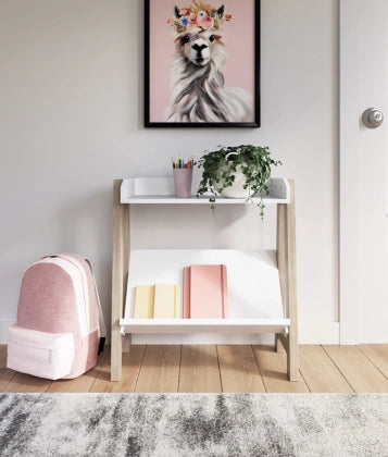 Whether for storage or display, this stylish small bookcase provides the perfect place to prop their ever-expanding book collection. The unique angled lower shelf and gallery rail top in white charmingly contrast with the light tan frame, creating a versatile piece ideal for small spaces.