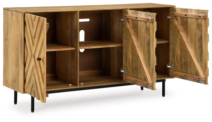 Your search for simple, chic design ends here. A versatile stunner, this accent cabinet adds a sophisticated aesthetic with diamond-patterned drawer fronts and a warm natural finish. It's gorgeous and ready to serve as a buffet or console.