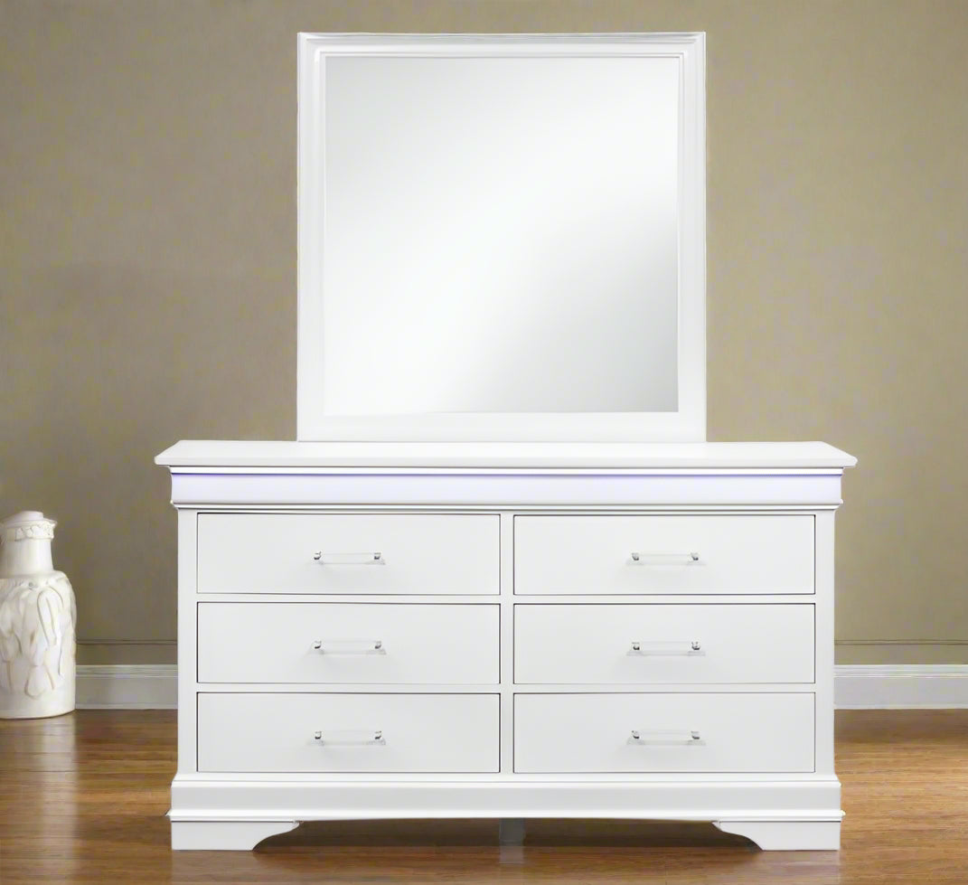 Upgrade your bedroom with the sleek and modern Charlie White Dresser and Mirror. The LED lighting adds a contemporary touch while illuminating your space. Made with high-quality materials, this dresser and mirror are both stylish and functional, giving you the perfect storage solution for your clothing and accessories.