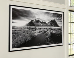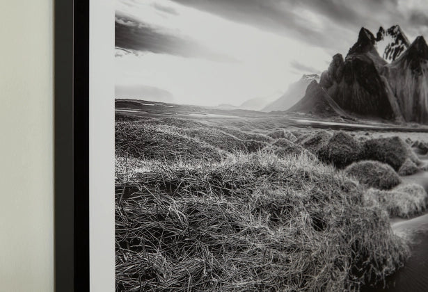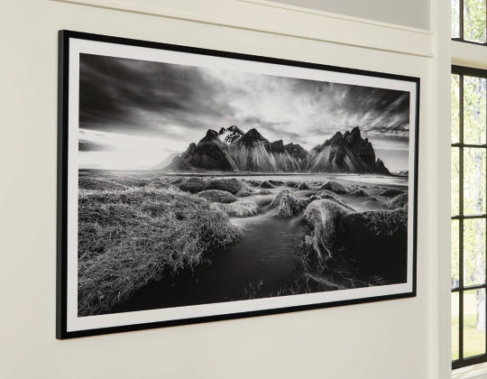 If you have your sights set on a striking landscape, this wall art is a natural wonder. Staggeringly beautiful, the framed black and white print showcases majestic mountains and a meandering stream. This moody and marvelous piece adds an air of dramatic beauty to your modern decor.
