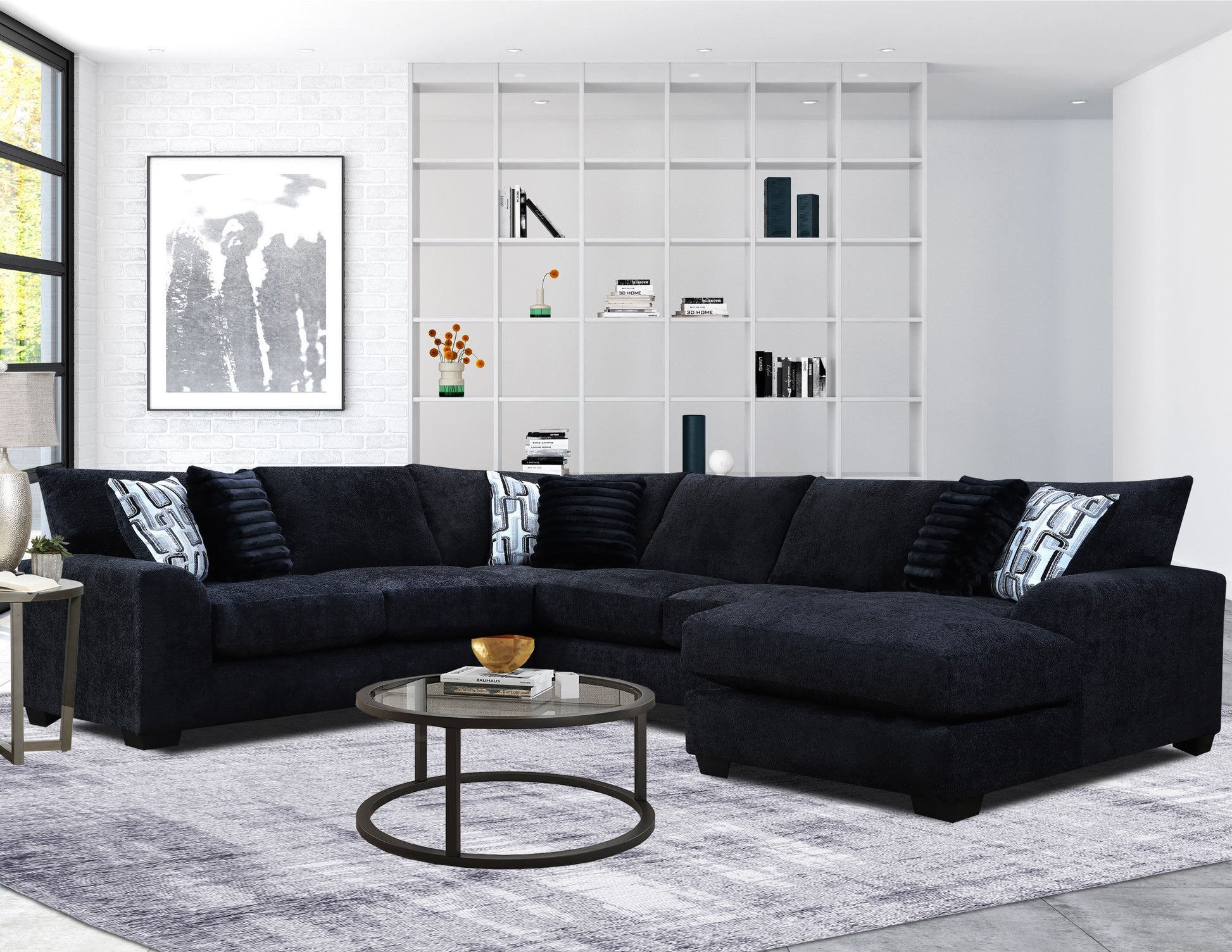 Modern uptown luxury meets traditional downhome comfort with this sectional by JCooper USA. Highlighted by soft knit upholstery, this transitional group features wide, low-profile arms and deep, comfortable seating. The group includes a luxurious chaise lounge that is perfect for kicking off your shoes and relaxing at the end of a long day. The striking black color of the sectional's fabric creates a grand silhouette, and the coordinating pillows add an irresistible final touch. Upholstery:100% Polyester.