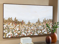 This wall art offers a beautiful contrast between a field of white flowers and the wide-open sky. A serene interpretation of the beauty of nature, its muted tones pair well with a variety of color palettes. Hand-painted embellishments complete the piece.