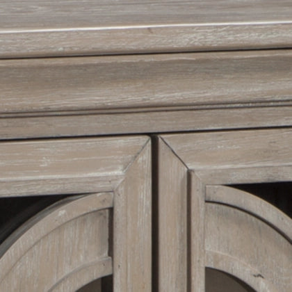Wowing with exquisite quatrefoil framing, made all the more dramatic with the contrast of clear glass, this 4-door cabinet serves up an easy-elegant aesthetic sure to satisfy. The light and lovely finish brings a relaxed sensibility to the scene.
