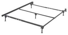 Sturdy metal bed frame supports queen mattresses and box springs. Bolts connect frame to most headboards.