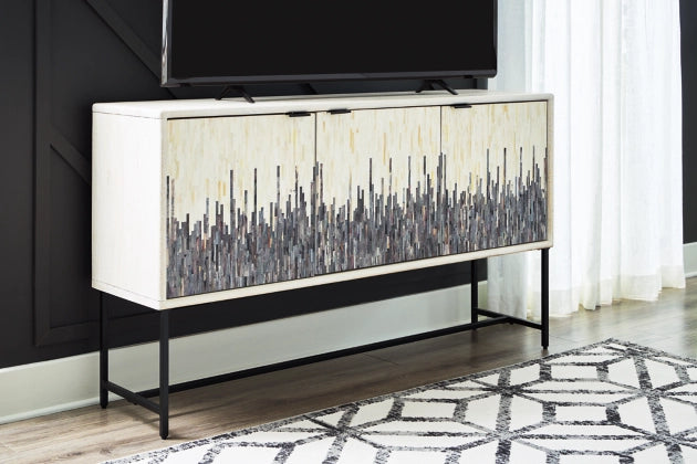 Looking for a showstopping accent for your home? This accent cabinet combines fashion and function in an exclusive way. It offers a creative take on a traditional cabinet, with a strip pattern in white, gray and black. Inside the doors, two shelves suit all your storage needs. Redefine your modern decor with this one-of-a-kind piece.
