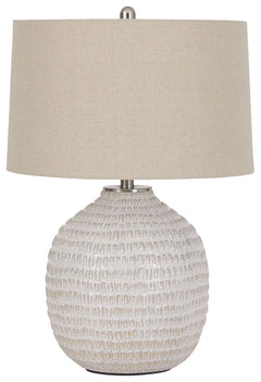 Style and function come together in this textured ceramic lamp. Combining a rounded base, with goldtone hardware, it's capped off with a simple natural lampshade for complete elegance. Pair this lamp with a wide variety of furniture styles to bring incandescent style to any space.