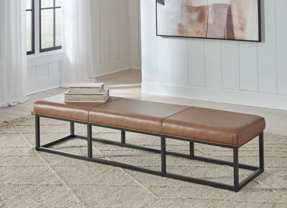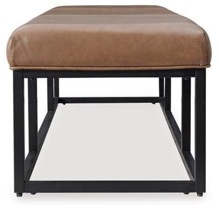 This accent bench takes a contemporary approach to everyday function. Showcasing a sleek combo of caramel leather upholstery and a black frame, it's a chic and convenient seating solution. Place this bench by the entryway, or at the foot of your bed, as a spot for slipping on shoes or resting bags and purses.