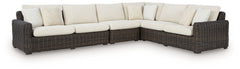 Add luxury, comfort and durability to alfresco fun. This outdoor sectional captures the textural beauty of wicker while withstanding the elements, from rain to shine. With a UV-resistant design, the wonderfully low-maintenance Nuvella+™ fabric maintains its good looks over time. Deep, roomy seating completes the piece, offering ample space to sprawl out.