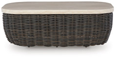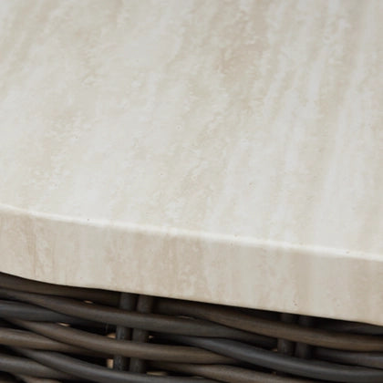 Add luxury, convenience and durability to alfresco fun. This outdoor coffee table captures the textural beauty of wicker while withstanding the elements, from rain to shine. With its marble-look aluminum top, you can stylishly stage decor or keep snacks and drinks in reach.