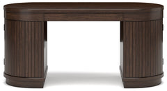 This home office desk is perfectly modern in every way. Finished on both sides in a rich wood tone, it can be floated in a room or used as a divider. Two half round door cabinets, each with an adjustable shelf, deliver a well-organized space for work-from-home professionals. It's a striking study in upscale contemporary form and function.