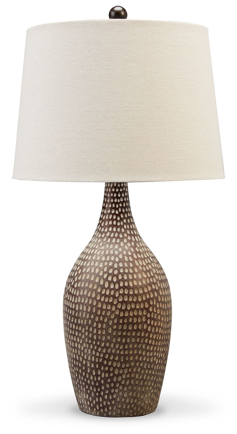 Inspired by ancient artistry, this table lamp is perfect for contemporary or boho-chic interiors. Soft earthy hues and an asymmetrical dotted pattern provide the look of a vintage collector's piece, while the modified drum shade makes it thoroughly modern.