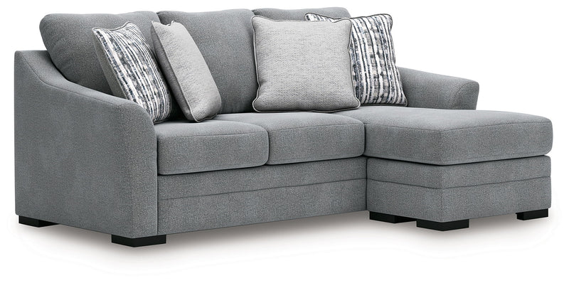 How does comfort, convenience and sleek style sound? We thought so. Crafted with soft, stain-resistant Next-Gen Nuvella™ fabric, this soothing blue-gray sofa chaise is a breeze to clean. Subtly flared arms keep everyday relaxation within easy reach.