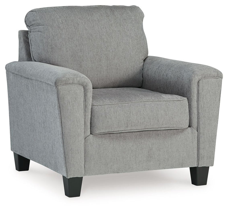 This accent chair offers an updated profile and contemporary design. Complete with padded arms and welted cushions in a versatile light gray color, this piece seamlessly complements various interiors. With its stylish design and cozy feel, it's ideal for relaxation and entertainment.