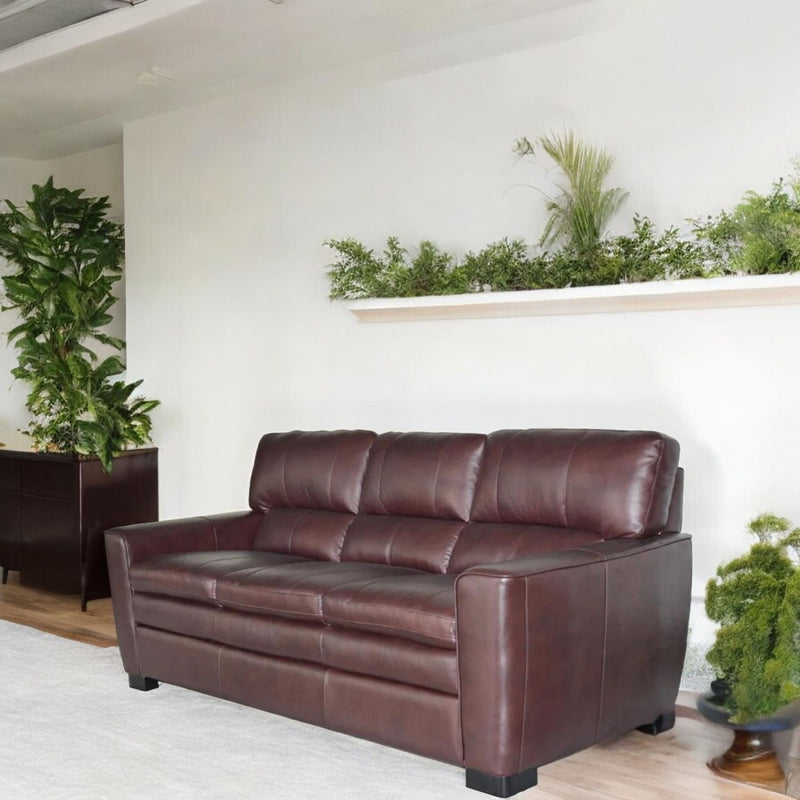 Experience luxury and comfort in our Leland Sofa Burgundy. With its rich color and plush upholstery, this sofa will be a standout piece in any room. The sturdy construction and high-quality materials ensure durability and long-lasting use. Elevate your living space with this stylish and elegant sofa.