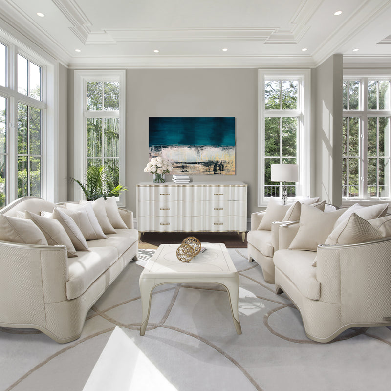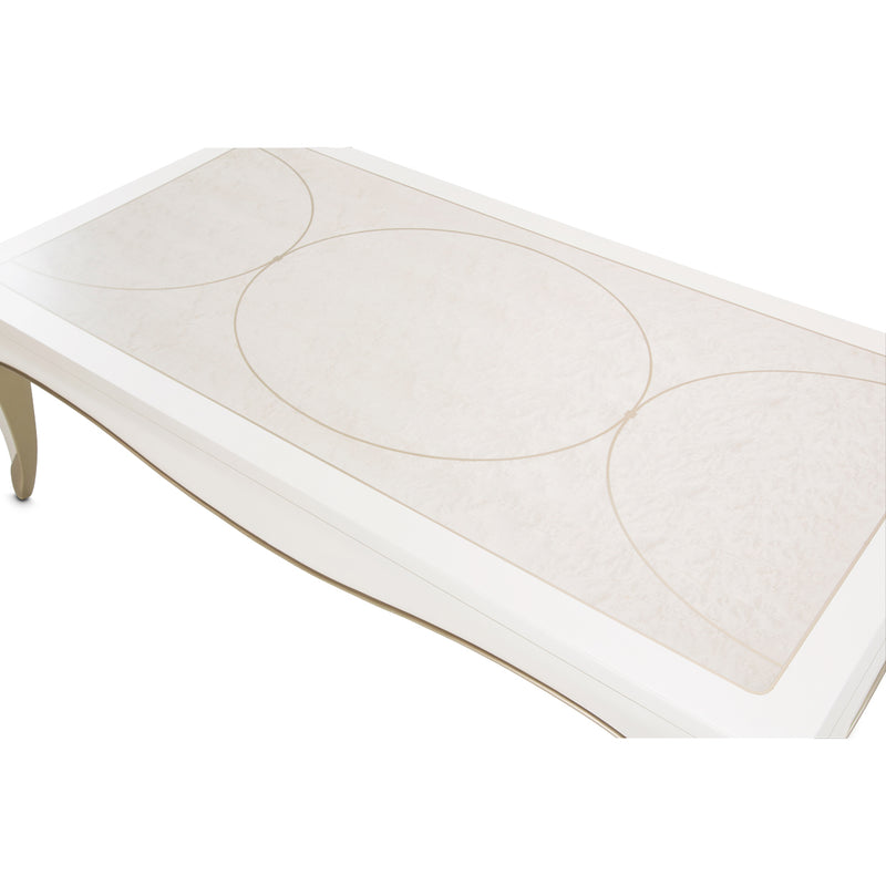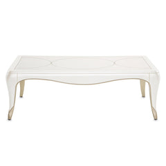 A vision of refined glamour, the London Place Cocktail Table captivates with its graceful curves and radiant sheen. The tabletop showcases a birdseye maple veneer, delicately framed by a painted platinum motif that glimmers with understated sophistication. Sleek tapered legs and a sculptural apron—finished in a lustrous Creamy Pearl with platinum accents—lend the piece a sense of lightness and architectural poise. Designed to anchor your living room with quiet opulence, it’s the perfect balance of artistry and modern elegance.