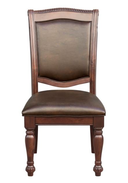 Elegantly designed for the traditional dining room is the Lordsburg Collection. Supported by the double pedestal base is the tabletop where the magnificent parquet veneer is highlighted by the brown cherry finish that covers the collection. Heavily carved molding provides distinct accent to the tabletop while brown faux leather covers the seats and backs of the coordinating wood-framed chairs. The accompanying hutch and buffet provide ample storage space for your tabletop accessories.