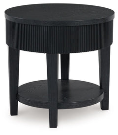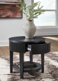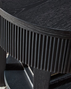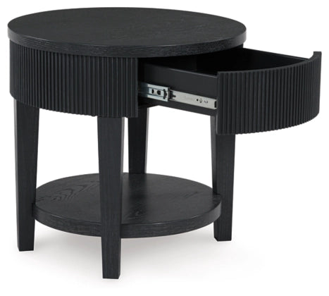 Classic and cool in dark charcoal, this end table brings contemporary convenience to your living room. Short on storage? The trendy reeded apron conceals a drawer perfect for remotes, controllers and other entertainment accessories. What a perfect marriage of style and functionality.