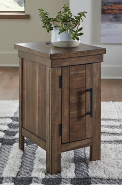 This chairside end table might appear simple at first sight. But a closer look reveals beauty in the details. With a plank-effect cabinet door, a tobacco brown finish and antiqued bronze-tone hardware, it’s simply beaming with charm. This side table's cabinet and tabletop space, along with USB charging, will serve you well for years to come.