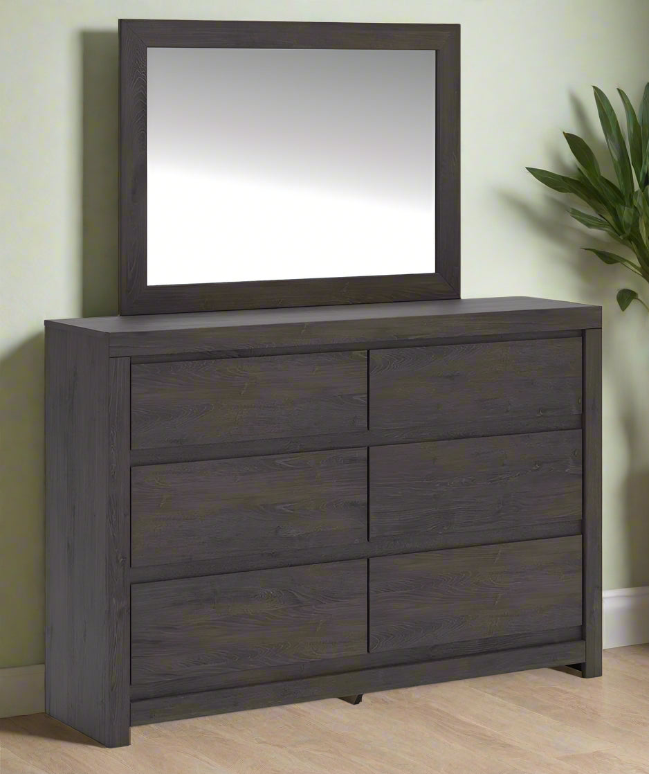 Find serene simplicity in the clean lines and dark neutral tones of this dresser with mirror. It’s a sincere approach to modern elegance, giving you high style at a great value. A sleek hardware-less design creates a fuss-free look. Short on storage? This dresser’s smooth-gliding drawers keep clothes and clutter neatly tucked away.