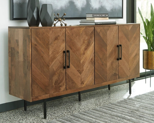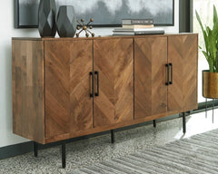 Storage options abound with this accent cabinet featuring 4 chevron pattern doors accented by long dark gray finished metal door pulls. Store dinnerware, cookbooks and many other options within the sideboard which features 2 fixed shelves. The light brown finish will complement virtually any room decor.