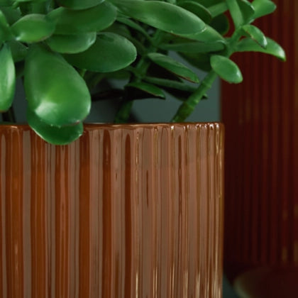 This ceramic vase makes a relaxed style statement. Its casual design and earthy burnt umber glaze complement your laid-back sensibilities. Delightfully simple and simply delightful, this vase subtly wows on its own or when filled with your favorite flowers whether it's displayed indoors or out.