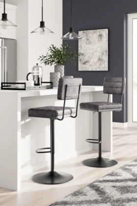 Have a seat in sleek style with this upholstered swivel bar stool. Contemporary with a casual vibe, it's dressed to impress with a metal frame and a cushioned seat and back wrapped in faux leather. Along with the bar stool's smooth-gliding swivel, a pedestal allows you to adjust its height to accommodate your space.