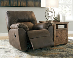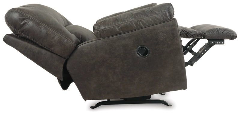 With plush cushions and angled pillow top arms, this rocker recliner takes comfort to a whole new level. Faux vintage leather requires minimal care, making this piece ideal in homes with children and pets. The seat reclines with the pull of a tab, putting total relaxation at your fingertips.