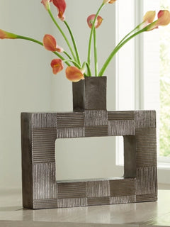 Stunning from all angles, this vase's contemporary geometric form acts as a captivating focal point for your mantle or bookshelf. Its antiqued nickel-tone body is detailed with subtle texture for added visual appeal. What a perfect fit for those seeking forward-thinking style.