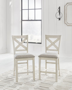This counter height bar stool is sure to impress come mealtime. With its white finish and light gray upholstery, farmhouse-style seating has never been so fashionable. All that’s missing is you and your family.