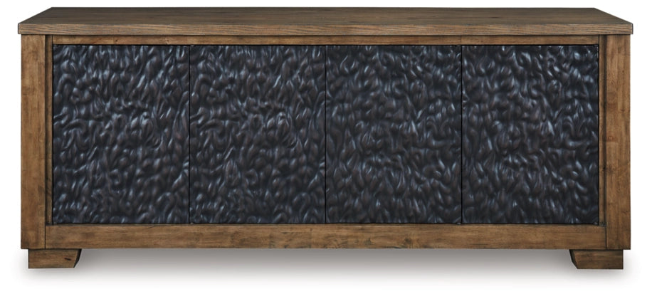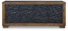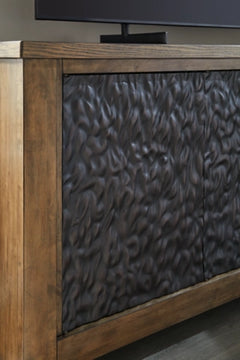 This TV stand is not just furniture—it’s a work of art. The cabinet door design is nothing short of a masterpiece. Its deep tribal texture and two-tone finish convey an intentional hand-carved feel creating a unique and attractive surface. Boasting an abundance of storage space and cord management, the large-scale silhouette accommodates flat screen TV’s up to 85 inches.
