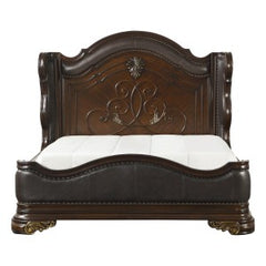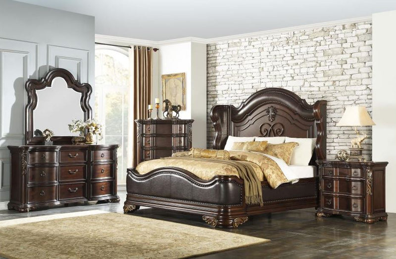 Grandly styled for the traditional home is the Royal Highlands Collection. Prominent decorative scrolling adorns the headboard while heavier, carved scrolling accents the pilasters and feet of each piece in the collection. The substantial wood framing of the bed creates a distinct serpentine profile that carries into the design of the case pieces. Brown faux leather provides complementing contrast to the rich cherry finish. Traditional cherry and birch veneers accenting furthers the elegant presentation of the Royal Highlands Collection.