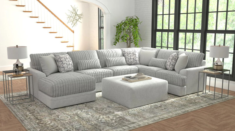 The Complete Hosting Solution. This is the pinnacle of the Titan experience. Combining the vast seating of the 3-piece LSF Chaise sectional with a matching Ottoman gives you total control over your comfort. The Mist fabric creates a serene, luminous environment, while the Cuddler Cushion technology ensures a worry-free, cloud-like experience for every guest.