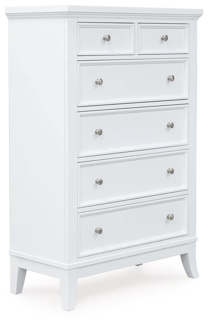 Clean, crisp and utterly contemporary. Brighten up your bedroom with this chest of drawers. Pair it with pops of color, or let the fresh-feeling white finish speak for itself—its versatile hue effortlessly adapts to your changing tastes. Stylized flare legs further elevate the look.