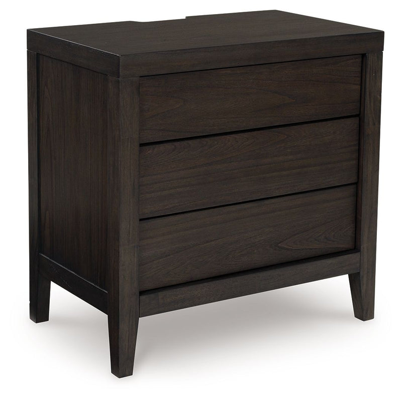 Create your ideal sanctuary with this nightstand. The dark espresso brown finish and clean lines are undeniably contemporary, but the attitude is more relaxed—our interpretation of metropolitan casual style. An off-the-floor design with tapered legs beautifully elevates the mood. Spacious drawers with ridged metal bar pulls keep essentials organized. And charging your devices is easier than ever, thanks to the USB ports conveniently located in the top. Whether you're starting your day or winding down, this stylish piece provides the perfect backdrop.