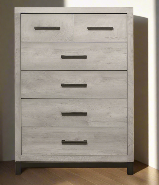 The sleek design of the Zephyr Collection pairs clean lines with modern convenience to create a style that will be the perfect palette for your design aspirations. Visually tying the chest together are the painted metal-finish banding of the base rail and the metal bar hardware that fronts each drawer, culminating in an accenting contrast to the gray faux wood finish of the melamine veneer.